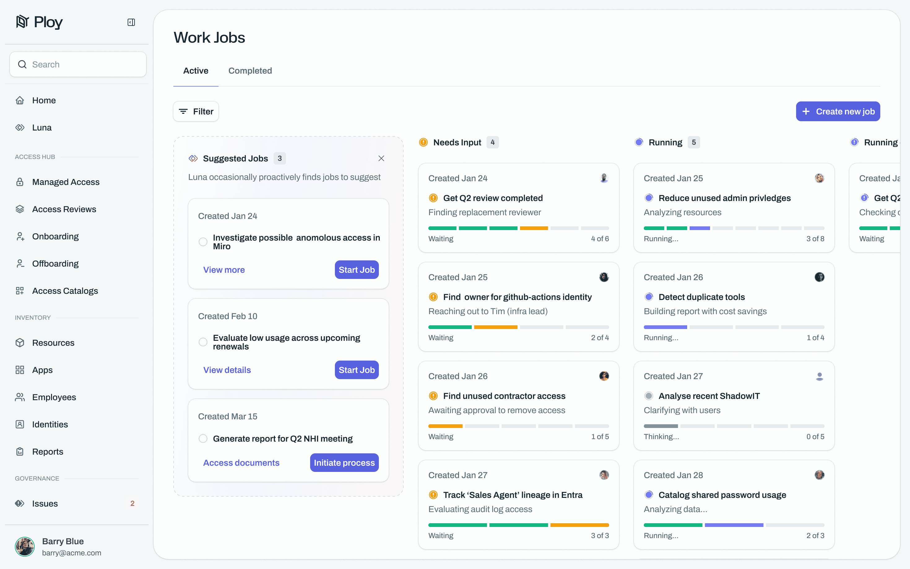 Ploy connects to your entire stack and lets Luna handle the rest. Stale access, compliance reviews, onboarding, offboarding, resolved automatically, around the clock.
